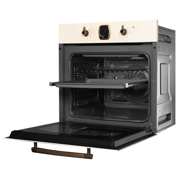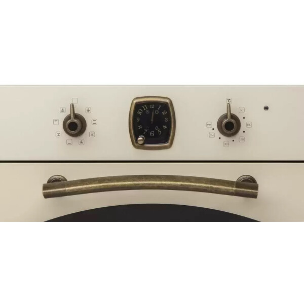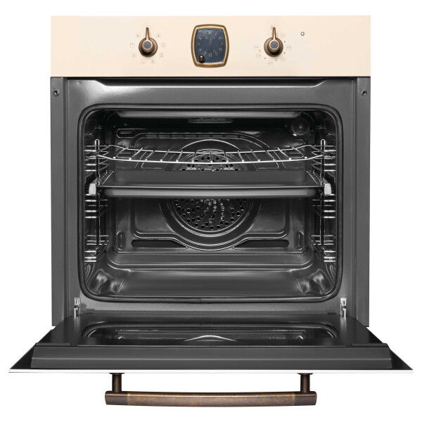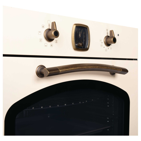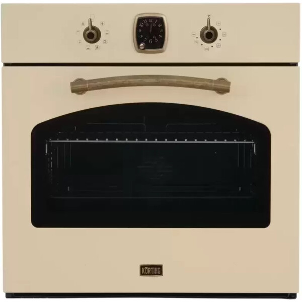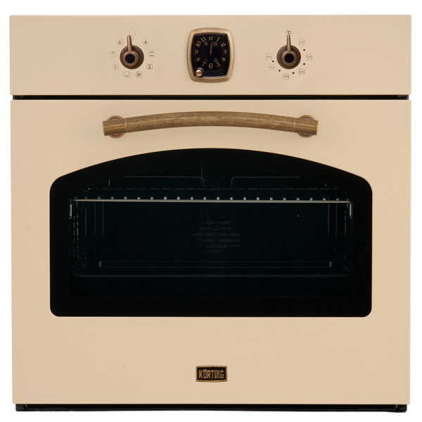 Духовой шкаф Korting OKB 481 CRB стильная модель в цвете слоновая кость. Аналоговые часы Franck Muller и поворотные переключатели цвета бронза подчеркивают ретро-дизайн. Телескопические направляющие обеспечивают устойчивое положение тяжелых противней, а функция автоматического отключения защищает духовой шкаф от перегрева. В комплект входит стеклянный противень, который легко очищается от загрязнений и может применяться при сервировке.