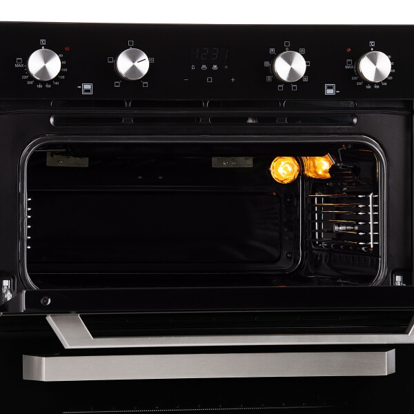 Две камеры духового шкафа работают независимо друг от друга, поэтому вы без труда можете настроить разные режимы приготовления, температуры, таймеры и готовить от двух до четырех блюд одновременно.