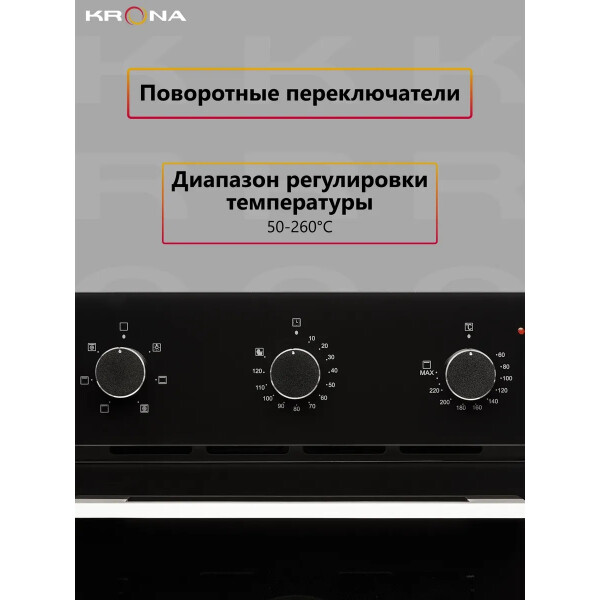 Управление осуществляется с помощью удобных поворотных переключателей. Таймер и подсветка камеры помогут контролировать процесс приготовления Ваших кулинарных шедевров.