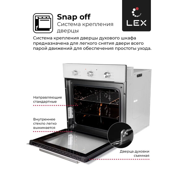 Программируемый таймер поможет настраивать и контролировать процесс приготовления. Двойное стекло дверцы LEX EDM 042 WH надежно защитит от ожогов. Эмаль легкой очистки, съемная дверца с системой SnapOff значительно упрощают процесс очистки.