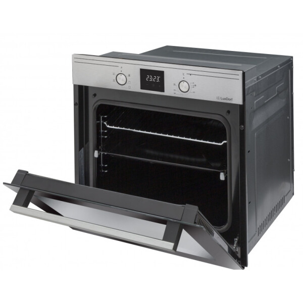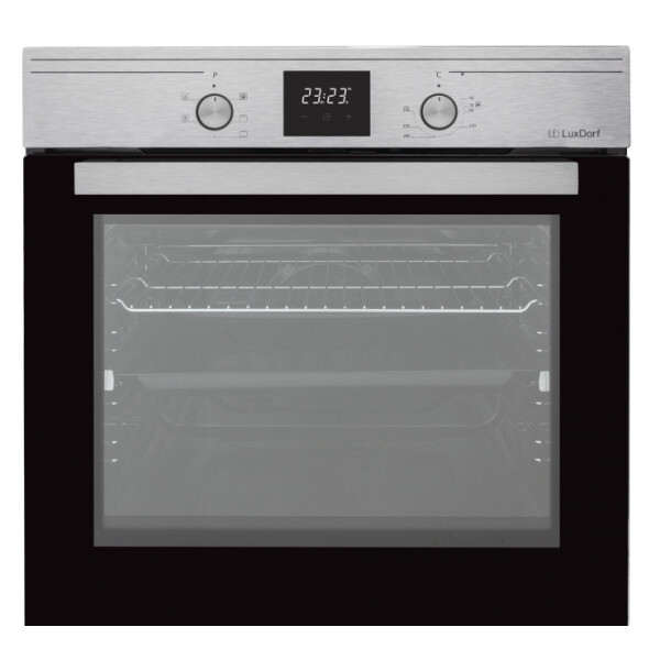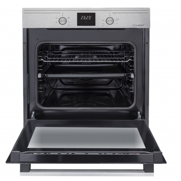 Управлять LuxDorf B6EM56050, выбирая необходимый режим приготовления, можно посредством утапливаемых поворотных переключателей. Все выставленные параметры функционирования духового шкафа, в том числе и время приготовления, можно наблюдать на электронном дисплее, расположенном между ручками управления.