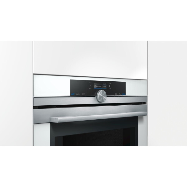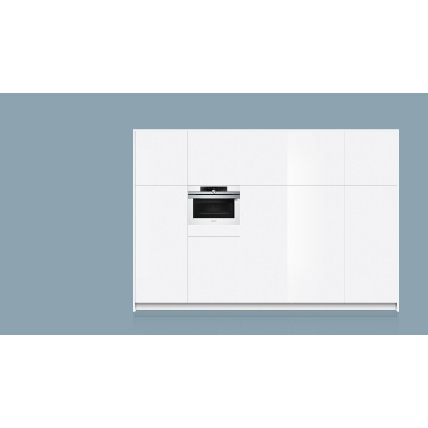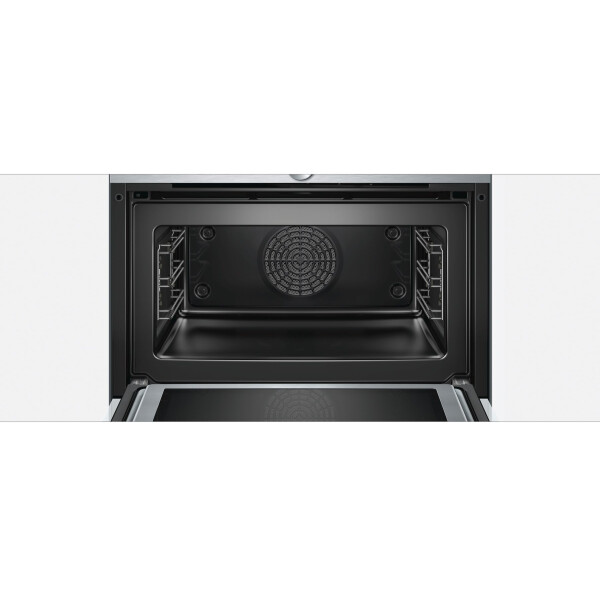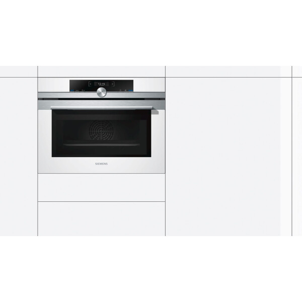 Встраиваемый компактный духовой шкаф с микроволнами Siemens CM633GBW1 оснащен 6ю видами нагрева, такими как: 4D-горячий воздух, горячий воздух eco, термогриль, большой гриль, малый гриль, родогрев посуды. Максимальная мощность составляет 900 Вт. Также имеется интеллектуальная инверторная технология (для продолжительной работы будет использована максимальная мощность в 600 Вт).