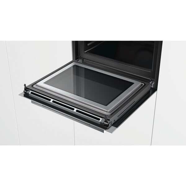 Электрический духовой шкаф Siemens HM676G0S1 в корпусе классического дизайна с элементами цвета «нержавеющая сталь» отличается превосходным внешним видом и расширенным функционалом. Управление осуществляется за счет поворотного переключателя и кнопок, расположенных на фронтальной панели. Модель имеет 13 режимов работы, а также функции гриля и конвекции, что существенно расширяет кулинарные возможности пользователя. Телескопические направляющие на одном уровне делают эксплуатацию максимально комфортной и безопасной.