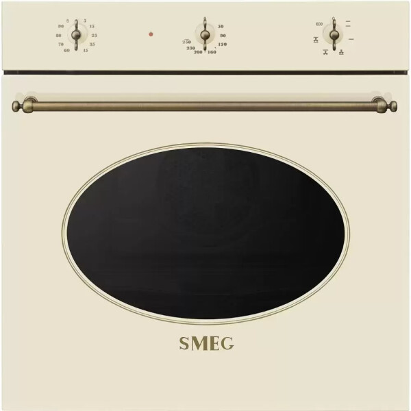 Smeg SF68M3VPOGL электрический духовой шкаф, собранный в Италии. Это гарантирует модели гармоничность дизайна и непревзойдённую долговечность. ГЛАВНЫЕ ХАРАКТЕРИСТИКИ В рабочей камере объёмом 70 л хватит места для запекания больших блюд, вроде целой курицы и пышных пирогов. Панелью управления очень удобно пользоваться: она представлена таймером, регулятором температуры и переключателем способа нагрева. ПРАКТИЧНОСТЬ ВО ВСЁМ Устройство снабжено дверцей с трёхслойным остеклением, которая остаётся прохладной даже в самый разгар готовки. Внутри прибора эмаль лёгкой очистки: такое покрытие не накапливает на своей поверхности жир и другие загрязнения.