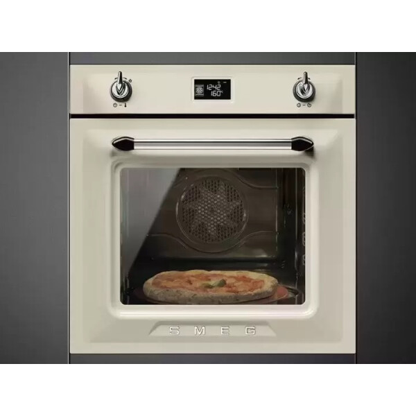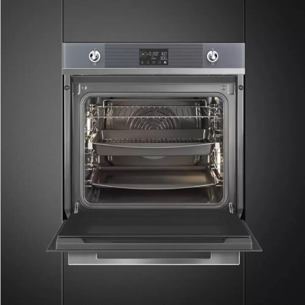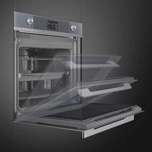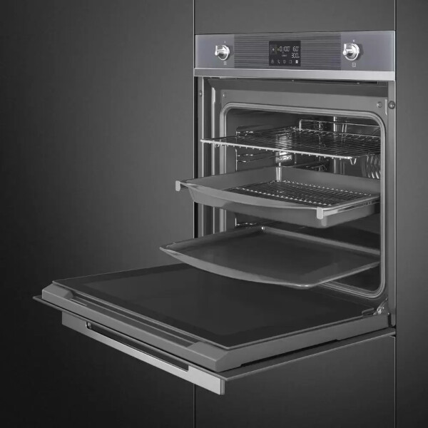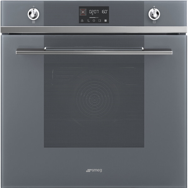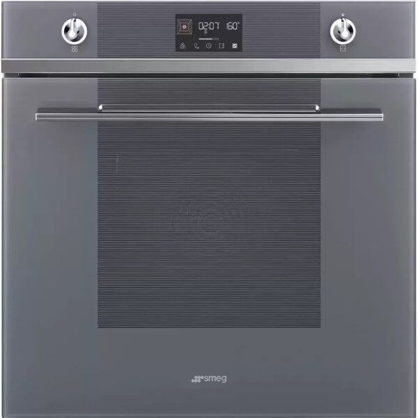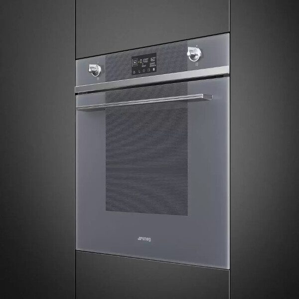 Встраиваемый электрический духовой шкаф Smeg SO6102TS имеет стильный дизайн благодаря серебристому глянцевому оттенку и хромированным ручкам.