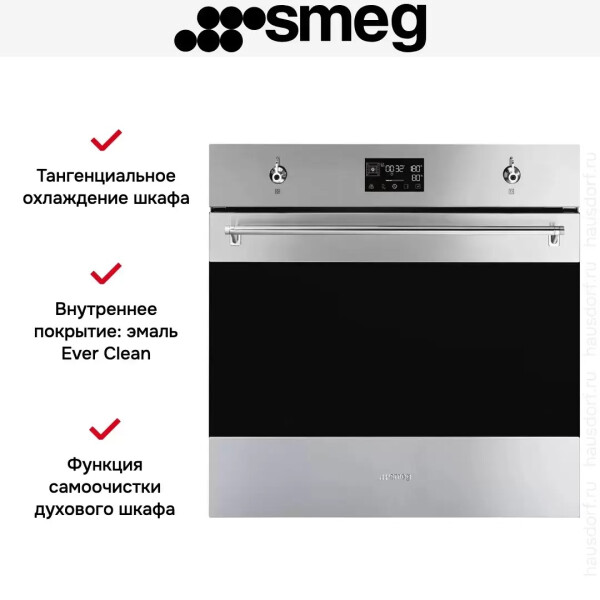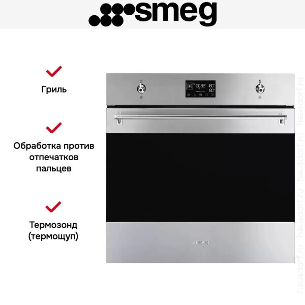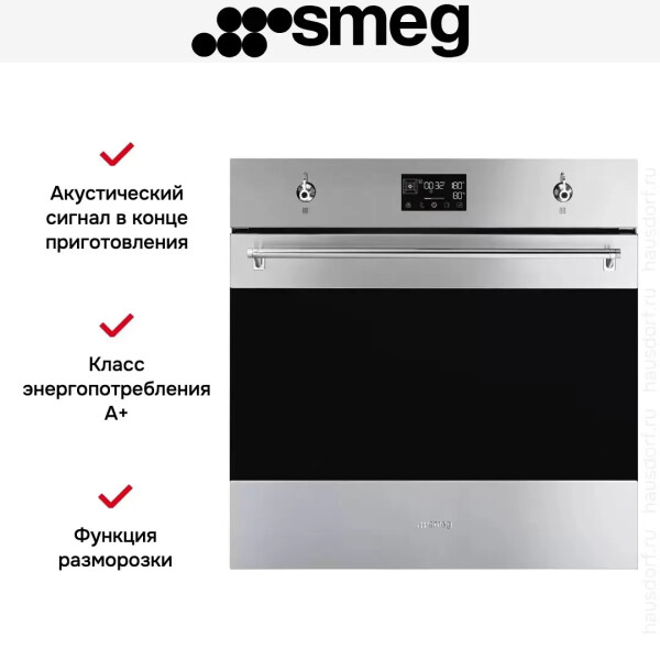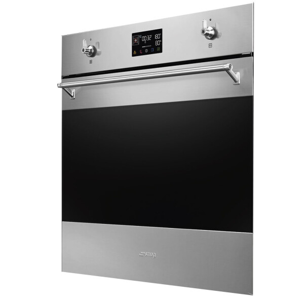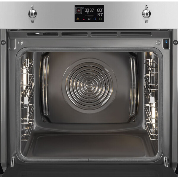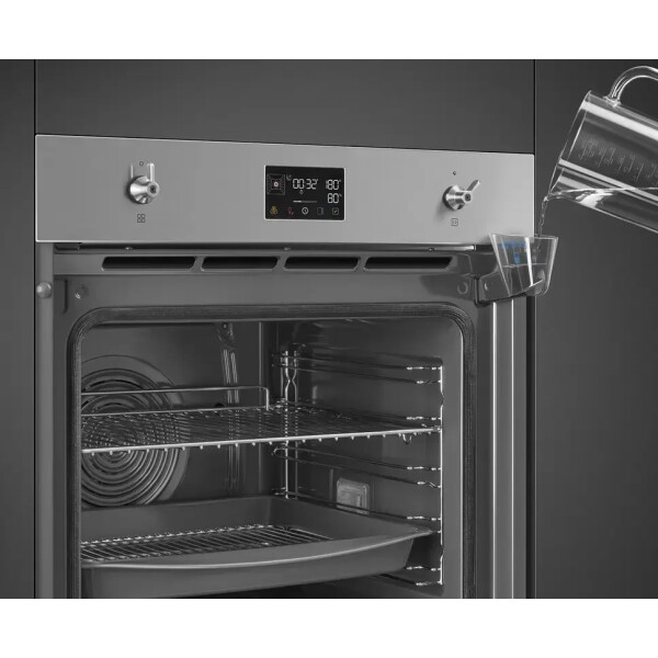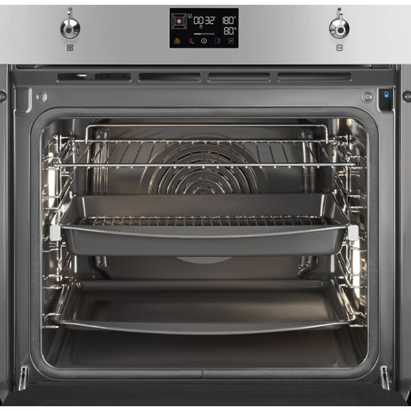 Духовой шкаф Smeg SOP6302S2PX оборудован дисплеем с сенсорным управлением, на котором отображается выбранный режим, время работы, таймер и установленные функции. Модель имеет 12 режимов приготовления, среди них, есть функция для пиццы. Имеется блокировка управления от случайного нажатия.
