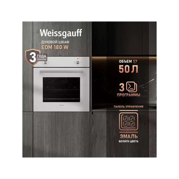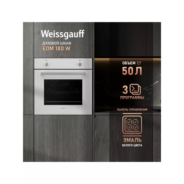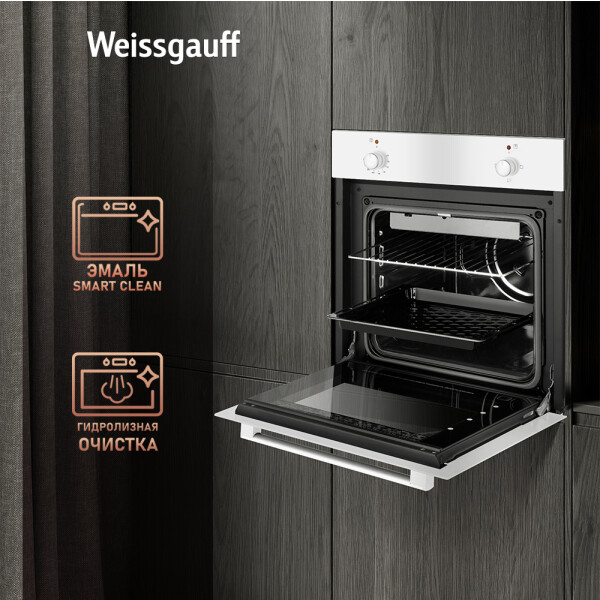 Электрический духовой шкаф от Weissgauff, выполненный в белом цвете, оснащённый механическими поворотными рукоятками Soft Switch и двойным остеклением дверцы воплощает в себе принцип разумной достаточности, предлагаю пользователю только самые необходимые и нужные режимы по действительно доступной цене!