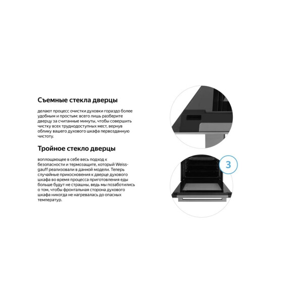Тройное стекло дверцы, воплощающее в себе весь подход к безопасности и термозащите, который Weissgauff реализовали в данной модели. Теперь случайные прикосновения к дверце духового шкафа во время процесса приготовления еды больше будут не страшны, ведь производители позаботились о том, чтобы фронтальная сторона духового шкафа никогда не нагревалась до опасных температур.