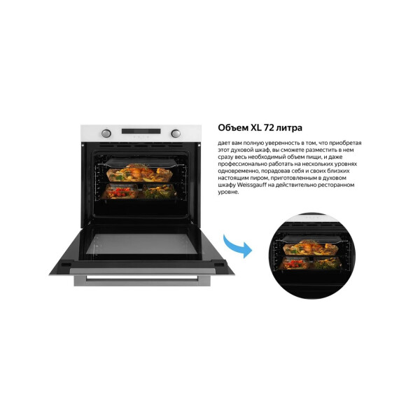 Объем XL 72 литра дает вам полную уверенность в том, что приобретая этот духовой шкаф, вы сможете разместить в нем сразу весь необходимый объем пищи, и даже профессионально работать на нескольких уровнях одновременно, порадовав себя и своих близких настоящим пиром, приготовленным в духовом шкафу Weissgauff на действительно ресторанном уровне.
