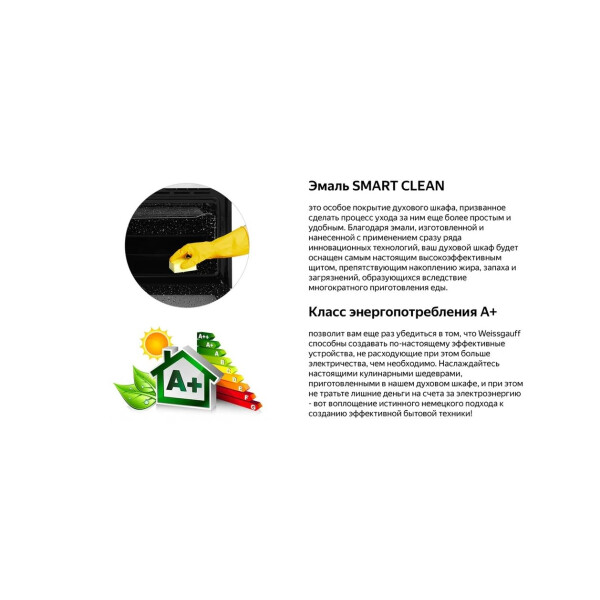 Класс энергопотребления А+ позволит вам еще раз убедиться в том, что Weissgauff способны создавать по-настоящему эффективные устройства, не расходующие при этом больше электричества, чем необходимо. Наслаждайтесь настоящими кулинарными шедеврами, приготовленными в нашем духовом шкафе, и при этом не тратьте лишние деньги на счета за электроэнергию - вот воплощение истинного немецкого подхода к созданию эффективной бытовой техники!