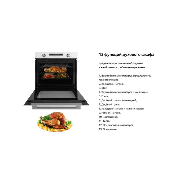 13 функций духового шкафа, предлагающих широкий выбор по-настоящему полезных и востребованных режимов: Верхний и нижний нагрев (традиционное приготовление), Кольцевой нагрев, ЭКО, Верхний и нижний нагрев + конвекция, Гриль, Двойной гриль с конвекцией, Двойной гриль, Кольцевой нагрев + нижний нагрев, Нижний нагрев, Разморозка, Тесто, Предварительный нагрев, Освещение.