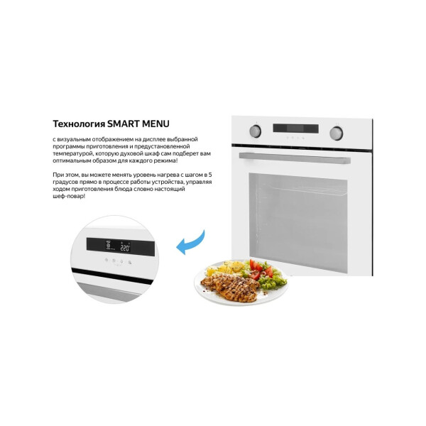 Технология SMART MENU с визуальным отображением на дисплее выбранной программы приготовления и предустановленной температурой, которую духовой шкаф сам подберет вам оптимальным образом для каждого режима! При этом, вы можете менять уровень нагрева с шагом в 5 градусов прямо в процессе работы устройства, управляя ходом приготовления блюда словно настоящий шеф-повар!