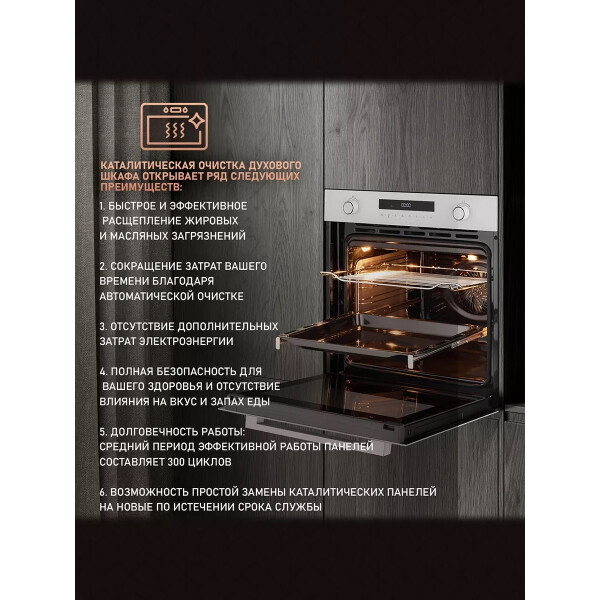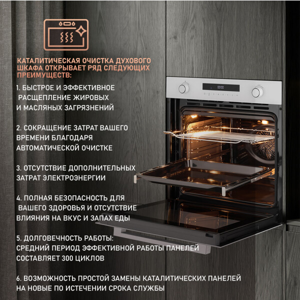 Каталитическая очистка - особая технология, реализованная благодаря специальным панелям, интегрированным в боковые стенки камеры. Под воздействием высокой температуры, все жировые накопления сами распадаются на воду и углекислый газ при попадании на эти панели, значительно облегчая Вам процесс очистки духового шкафа!