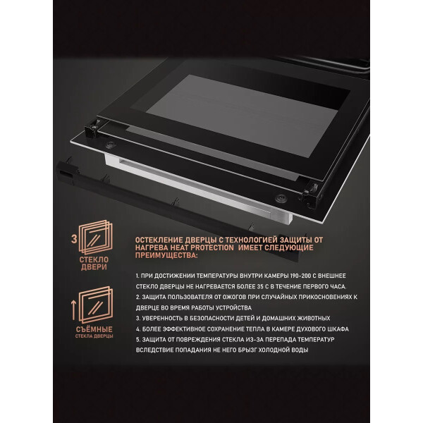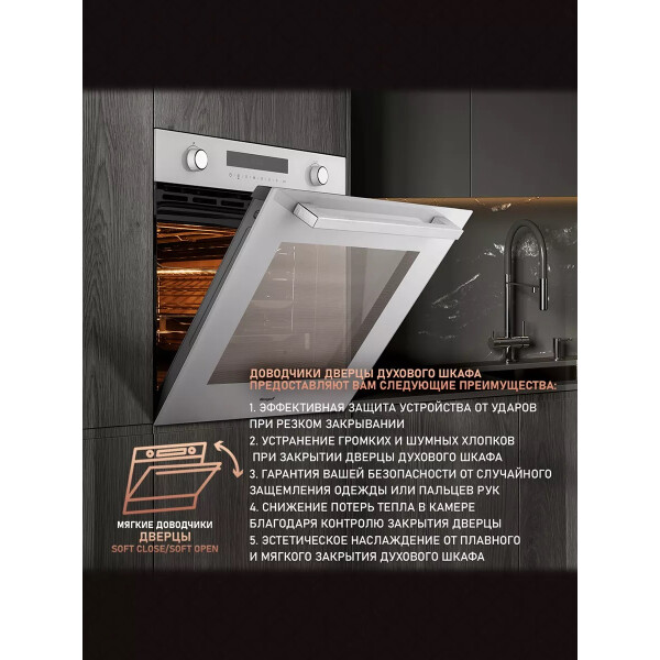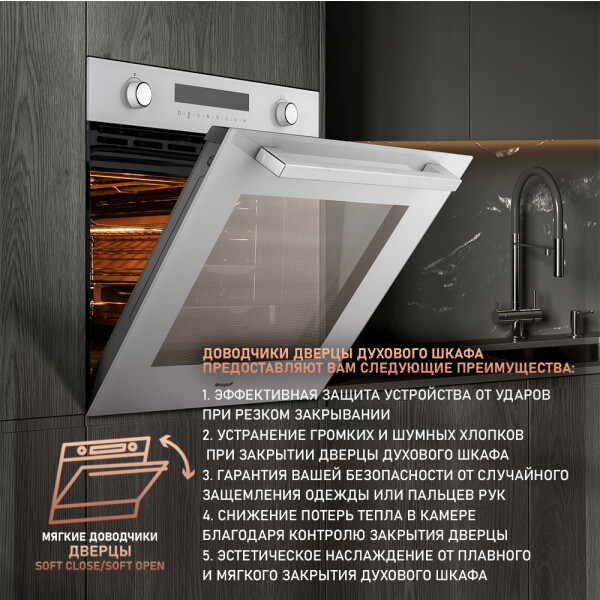 Мягкие доводчики дверцы SOFT CLOSE + SOFT OPEN, позволят защитить ваш духовой шкаф от повреждений при случайном захлопывании дверцы устройства, а также обеспечить мягкое и плавное открытие, когда вам необходим доступ к камере. Реализованная нами в данной модели технология позволяет погасить вибрацию, уменьшить нагрузку на дверцу и корпус духового шкафа, автоматически доводя дверцу мягким и плавным движением.