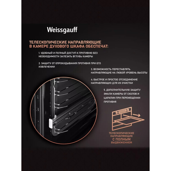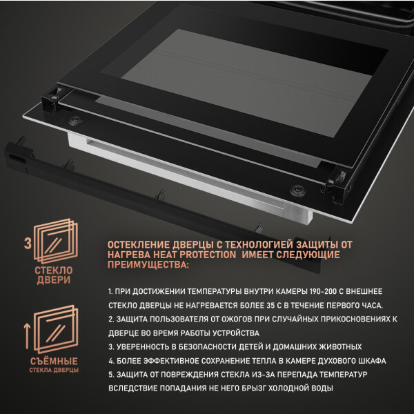 Тройное стекло дверцы, воплощающее в себе весь подход к безопасности и термозащите, который Weissgauff реализовали в данной модели. Теперь случайные прикосновения к дверце духового шкафа во время процесса приготовления еды больше будут не страшны, ведь мы позаботились о том, чтобы фронтальная сторона духового шкафа никогда не нагревалась до опасных температур.