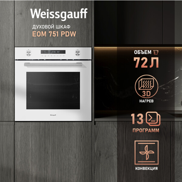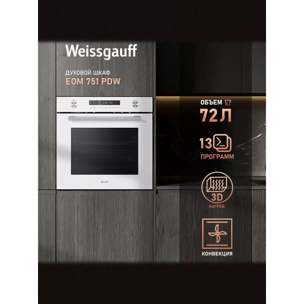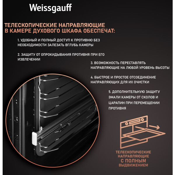 Объем XL 72 литра дает вам полную уверенность в том, что приобретая этот духовой шкаф, вы сможете разместить в нем сразу весь необходимый объем пищи, и даже профессионально работать на нескольких уровнях одновременно, порадовав себя и своих близких настоящим пиром, приготовленным в духовом шкафу Weissgauff на действительно ресторанном уровне.