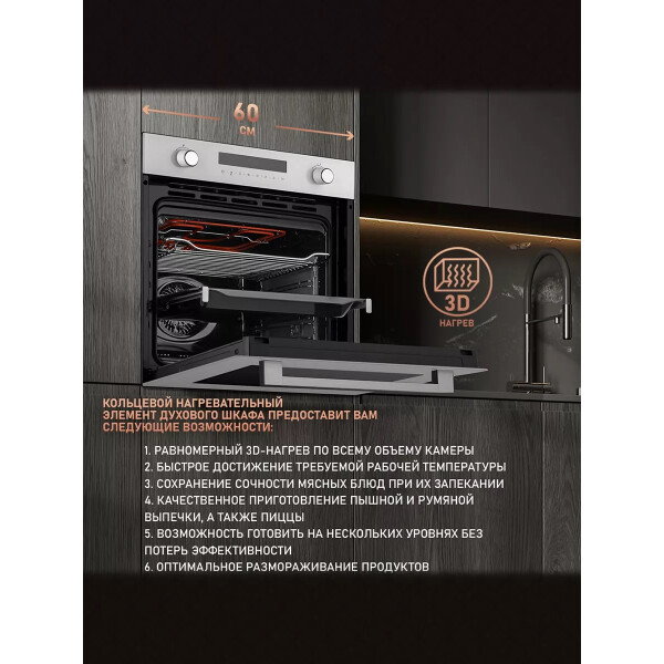 13 функций духового шкафа, предлагающих широкий выбор по-настоящему полезных и востребованных режимов: Верхний и нижний нагрев (традиционное приготовление), Конвекция, ЭКО, Верхний и нижний нагрев + конвекция, Гриль, Двойной гриль с конвекцией, Двойной гриль, Режим для пиццы, Нижний нагрев, Подсветка, Разморозка, Ферментация, Предварительный нагрев