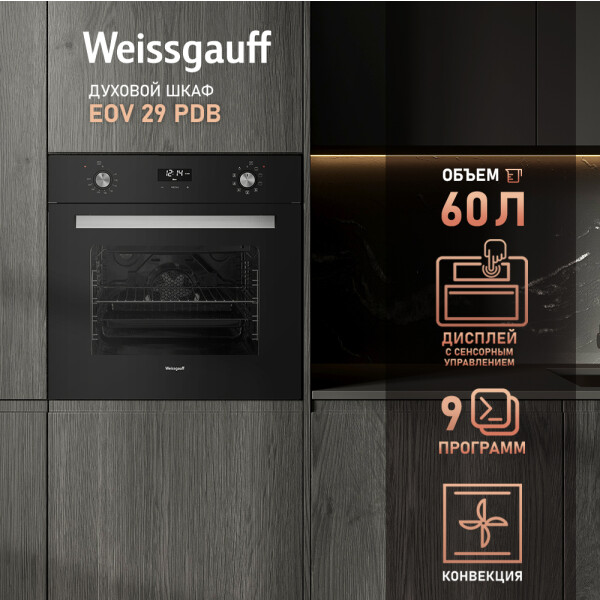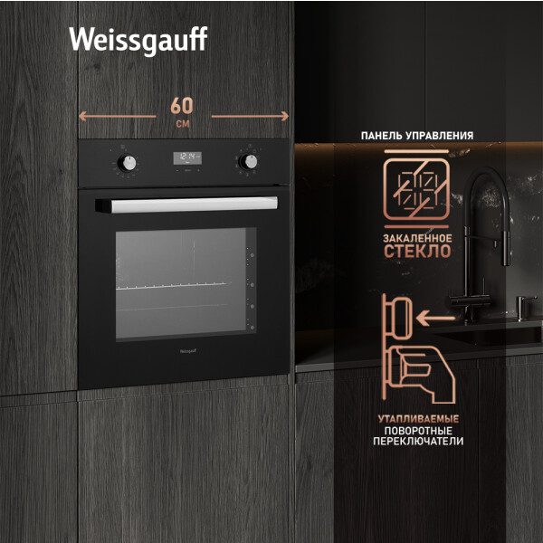 Электрический духовой шкаф от Weissgauff, выполненный в чёрном цвете, оснащён чувствительным сенсорным управлением, утапливаемыми рукоятками PIPO и 9 режимами, каждый из которых раскроет для вас новые возможности приготовления вкуснейших блюд!