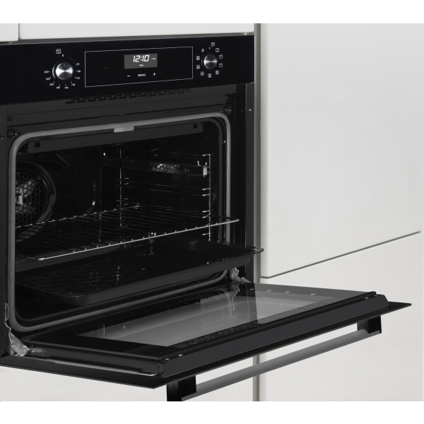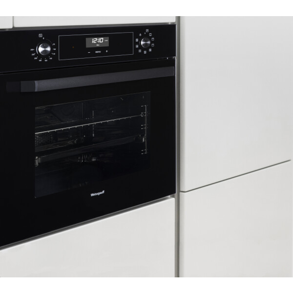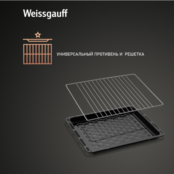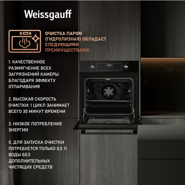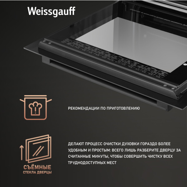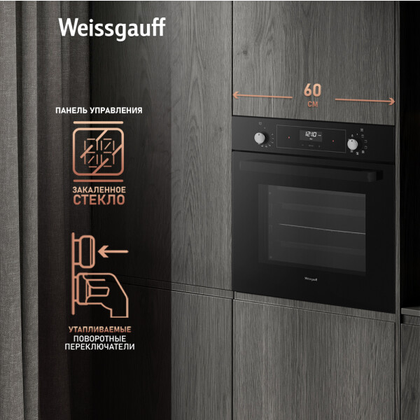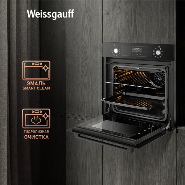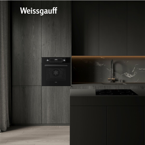Электрический духовой шкаф от Weissgauff, выполненный в чёрном цвете, оснащён телескопическими направляющими, чувствительным сенсорным управлением, утапливаемыми рукоятками PIPO и 9 режимами, что делает его одной из наиболее продвинутых моделей коллекции Hi-Tech SENSOR!