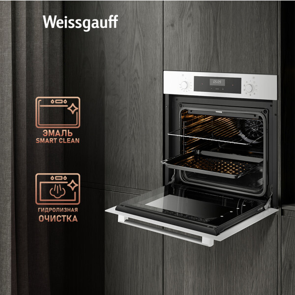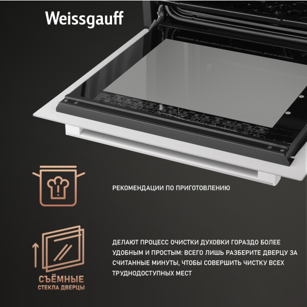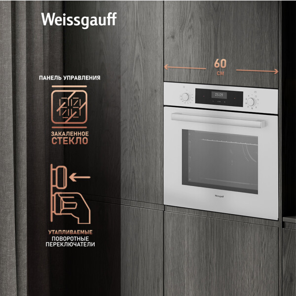 Электрический духовой шкаф от Weissgauff, выполненный в белом цвете, оснащён чувствительным сенсорным управлением, утапливаемыми рукоятками PIPO и 9 режимами, каждый из которых раскроет для вас новые возможности приготовления вкуснейших блюд!