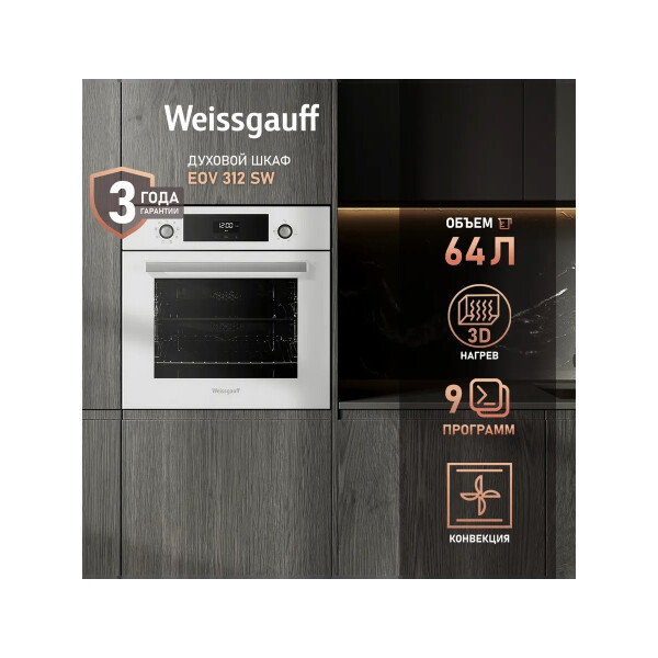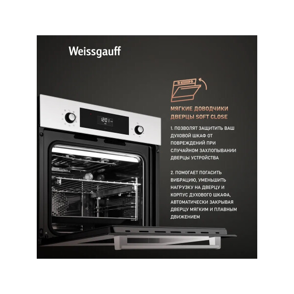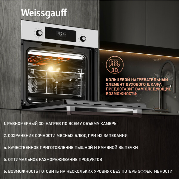 Объем 64 литра дает вам полную уверенность в том, что приобретая этот духовой шкаф, вы сможете разместить в нем сразу весь необходимый объем пищи, и даже профессионально работать на нескольких уровнях одновременно, порадовав себя и своих близких настоящим пиром, приготовленным в духовом шкафу Weissgauff на действительно ресторанном уровне.