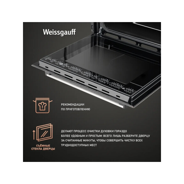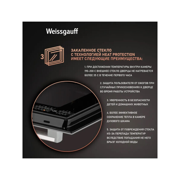 Тройное стекло дверцы, воплощающее в себе весь подход к безопасности и термозащите, который Weissgauff реализовали в данной модели. Теперь случайные прикосновения к дверце духового шкафа во время процесса приготовления еды больше будут не страшны, ведь мы позаботились о том, чтобы фронтальная сторона духового шкафа никогда не нагревалась до опасных температур.