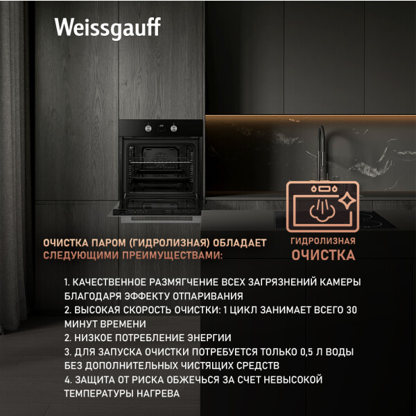 Гидролизная очистка - особая технология, благодаря который вы раз и навсегда забудете те дни, когда духовой шкаф необходимо было с большим трудом вычищать, вкладывая в это непозволительно много времени и сил. Weissgauff понимает, что в современном мире время является одной из наивысших ценностей - поэтому мы оснастили данную модель функцией гидролиза: всего лишь добавьте небольшое количество воды, и духовой шкаф сам отпарит все загрязнения, используя эффект сауны, после чего вам останется лишь провести по стенкам мягкой губкой, собрав их и удалив одним движением.