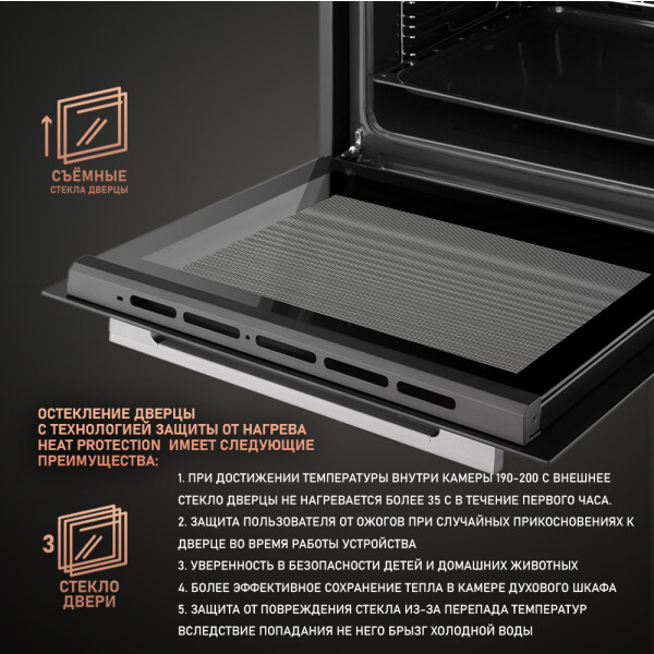 Съемные стекла дверцы, делают процесс очистки духовки гораздо более удобным и простым: всего лишь разберите дверцу за считанные минуты, чтобы совершить чистку всех труднодоступных мест, вернув облику вашего духового шкафа первозданную чистоту.
