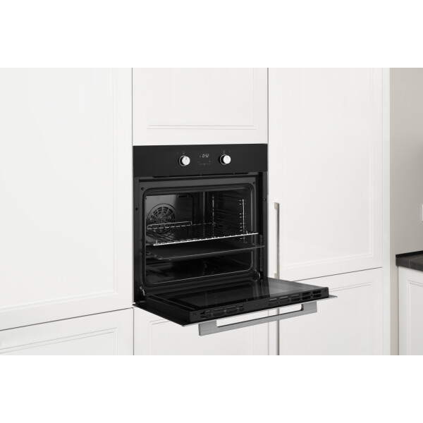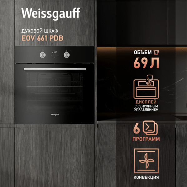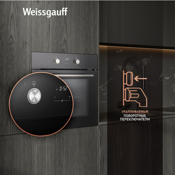 Электрический духовой шкаф от Weissgauff, выполненный в чёрном цвете, оснащён дисплеем с чувствительным сенсорным программатором, утапливаемыми рукоятками PIPO и 6 режимами, каждый из которых раскроет для вас новые возможности приготовления вкуснейших блюд!