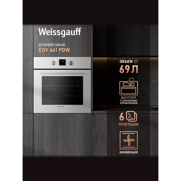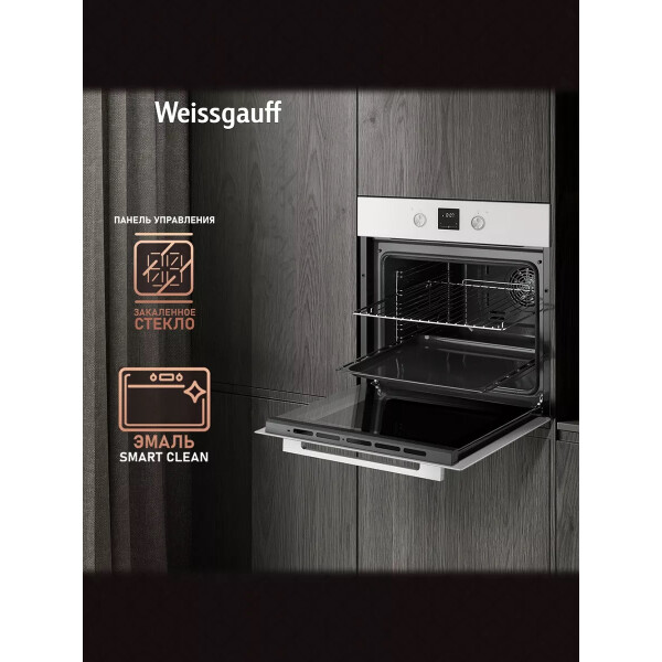 Объем XL 69 литров дает вам полную уверенность в том, что приобретая этот духовой шкаф, вы сможете разместить в нем сразу весь необходимый объем пищи, и даже профессионально работать на нескольких уровнях одновременно, порадовав себя и своих близких настоящим пиром, приготовленным в духовом шкафу Weissgauff на действительно ресторанном уровне.