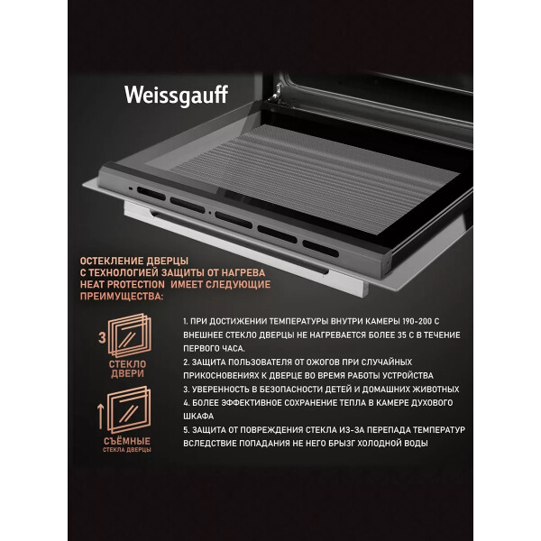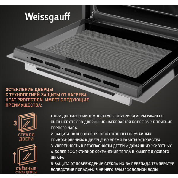 Тройное стекло дверцы, воплощающее в себе весь подход к безопасности и термозащите, который Weissgauff реализовали в данной модели. Такое стекло обеспечивает вам значительно большую степень защиты при случайных прикосновениях к нагревающейся дверце плиты, чем в моделях, не оснащенных технологией многослойного стекла. Для нас в Weissgauff важно, чтобы работа с бытовой техникой была не только приятной, но и безопасной!