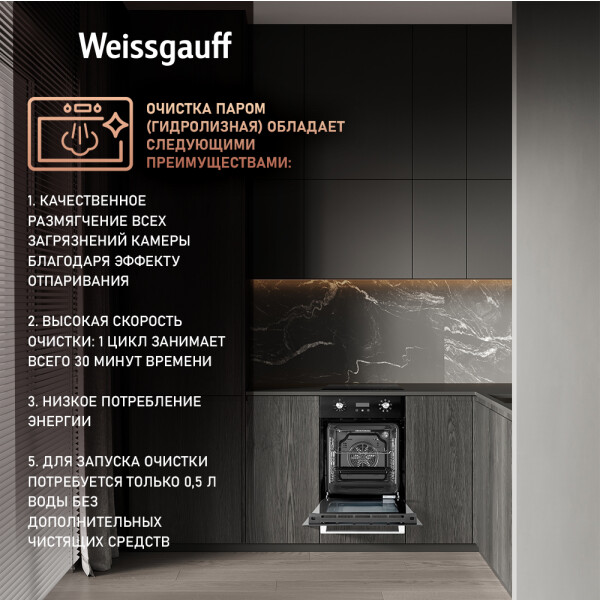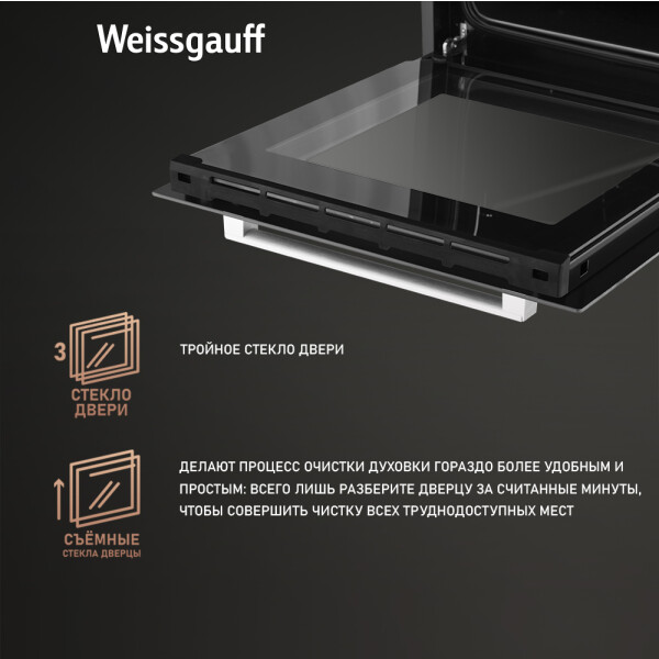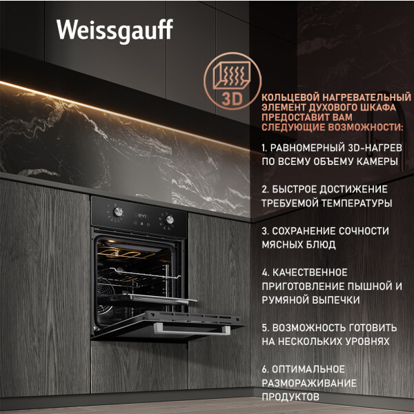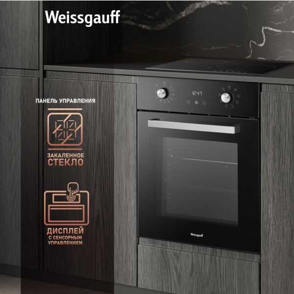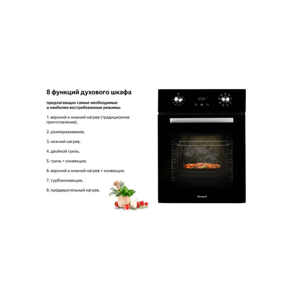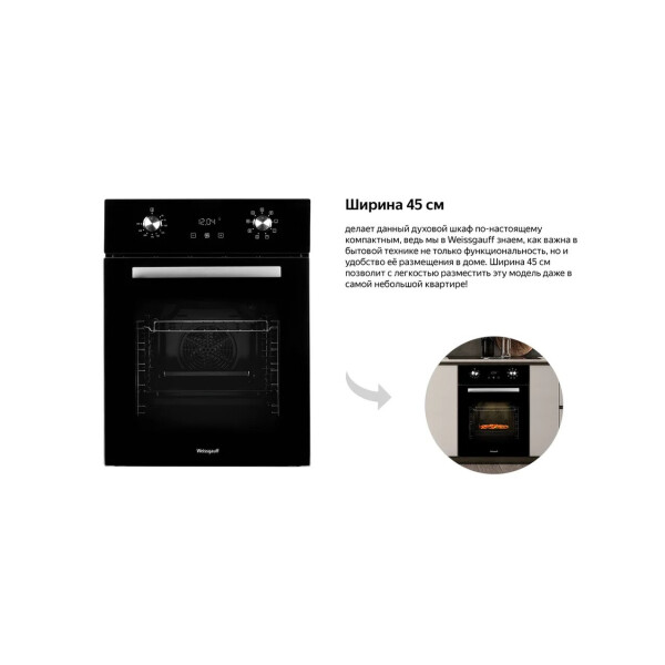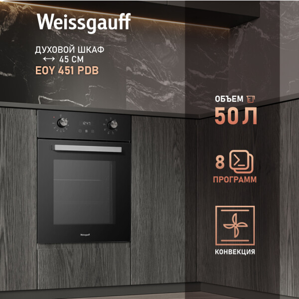 Встраиваемый электрический духовой шкаф Weissgauff EOY 451 PDB красивый и стильный дизайн не оставит равнодушным, а классический черный цвет не такой маркий как остальные. Данная модель порадует ещё своей многофункциональностью, а именно 8 функций: (верхний и нижний нагрев (традиционное приготовление), размораживание, нижний нагрев, двойной гриль, гриль + конвекция, верхний и нижний нагрев + конвекция, турбоконвекция, предварительный нагрев).