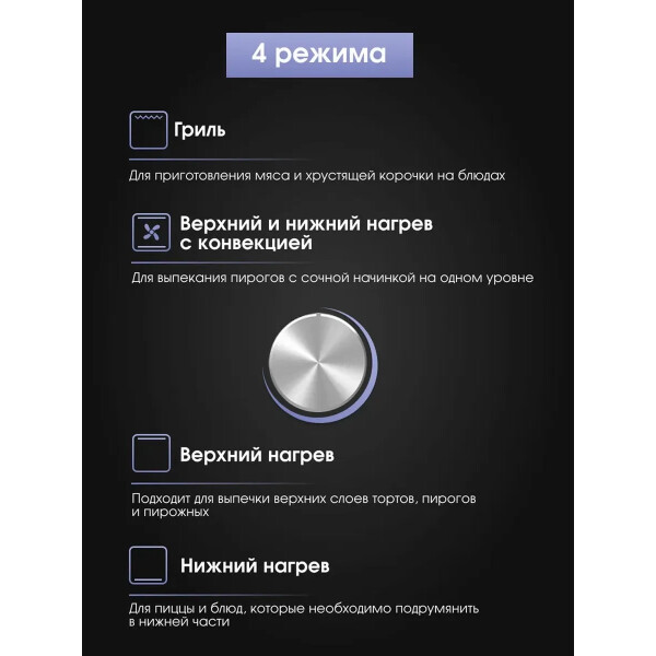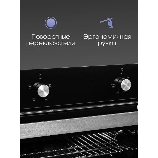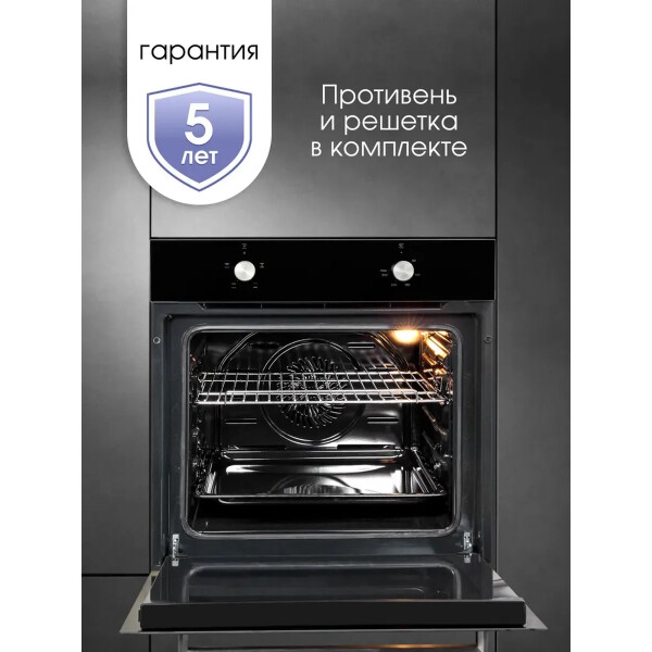 Мультифункциональная духовка имеет 5 режимов нагрева, гриль и освещение, что позволит Вам приготовить практически любое блюдо, а аналоговой программатор поможет Вам установить время работы духовки с последующим отключением.