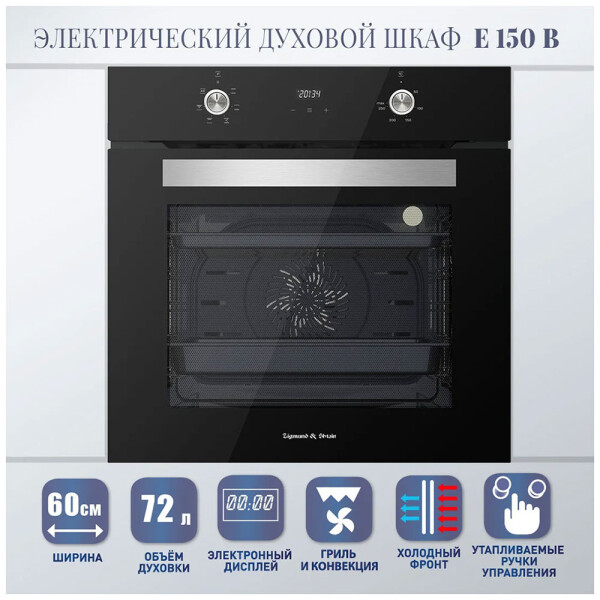 Электрическая духовка Zigmund Shtain E 150 B отлично подойдет для современной кухни. ведь ее фасад выполнен в чером цвете. Металлическая ручка дверцы. Утапливаемые переключатели и механический программатором сделают более комфортным уход за панелью управления, сам программатор даст Вам возможность установить момент включения, время работы с последующим отключением с выводом информации на цифровой дисплей. Дверца духовки электрической Зигмунд Штайн E 150 B имеет три съемных стекла, что исключает возможность получения ожога и делает чистку дверцы более удобным. Освещение внутреннего пространства позволят Вам лучше контролировать приготовление блюд. Виды нагрева: Верхний и нижний нагреватель, Верхний, нижний нагреватель и вентилятор, Нижний нагреватель, Гриль, Гриль и вентилятор, Быстрый разогрев. Комплектация: Решетка гриля. Используется для тарелок, форм для пирожных и порционных горшочков, для жарки и замороженных продуктов. Благодаря особой конструкции проволочные стеллажи остаются в горизонтальном положении даже после их извлечения из духового шкафа. Существует риск сдвинуть тарелку и пролить еду. Глубокий противень. Универсальная сковорода для пирожных, мягких пирожных, замороженных продуктов и мясных блюд с большими кусками мяса. Ее можно использовать в качестве посуды для сбора жира, когда вы готовите прямо на решетке. Плоский противень. Для пирожных и печенья, которые готовятся на противне. Не используйте для приготовления пищи плоский противень, так как он может вызвать распространение запаха, а масла могут выплеснуться из противня и испачкать духовой шкаф. Максимальная мощность потребления 2,65 кВт, Класс энергопотребления A