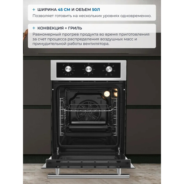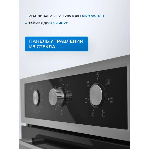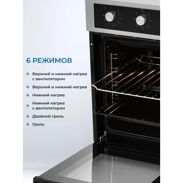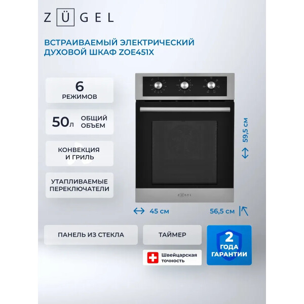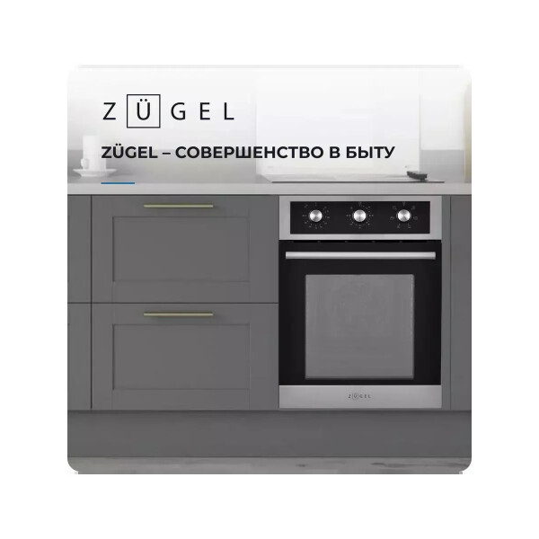 Электрический духовой шкаф ZUGEL ZOE451X стального цвета и утапливаемыми поворотными переключателями, станет Вашим помощником на кухне.