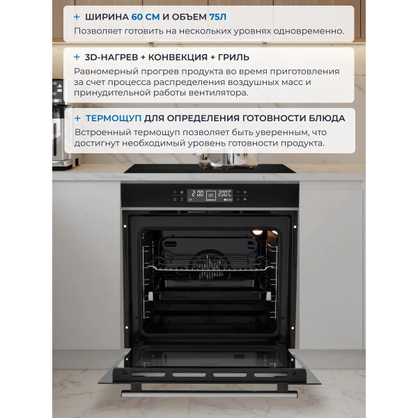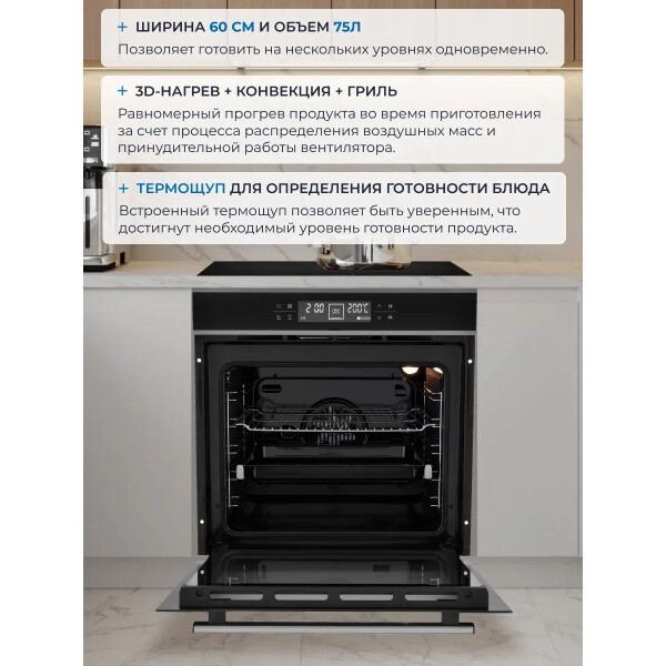 - Имеющийся в комплекте термощуп поможет Вам определить готовность продукта, не открывая дверцу шкафа, что очень порадует любителей выпечки;