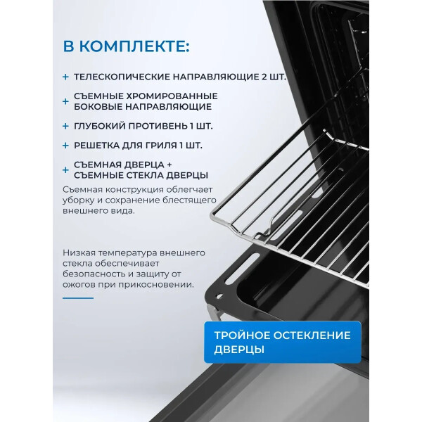 - Удобный и безопасный доступ к блюдам на противнях благодаря плавно выдвигающимся телескопическим направляющим на одном уровне;