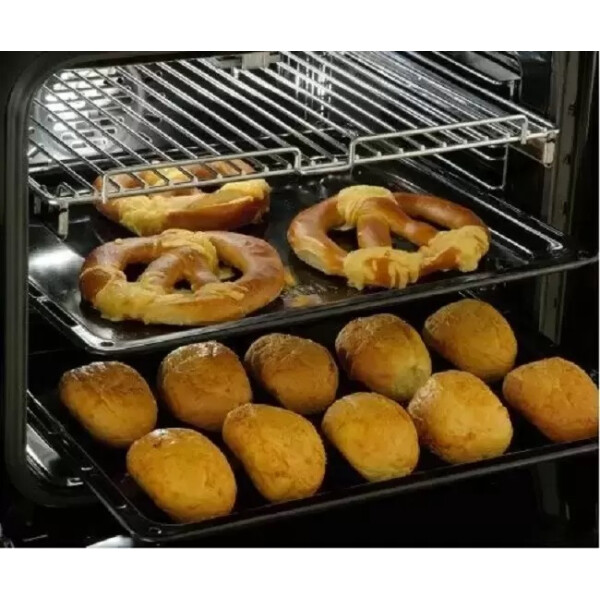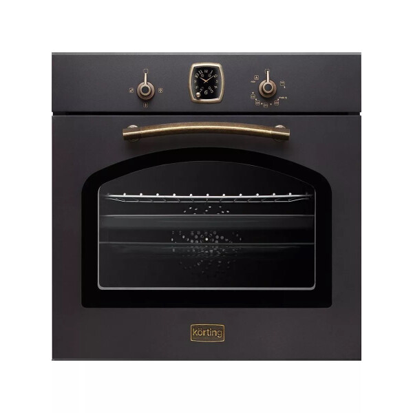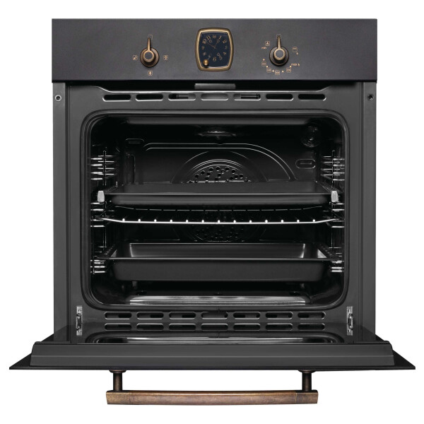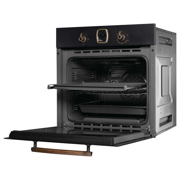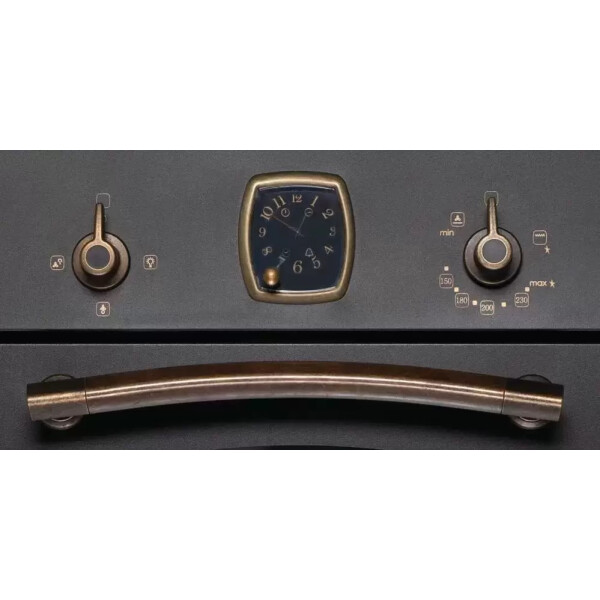Газовый духовой шкаф выполнен в стиле Retro в цвете «матовый черный». К числу преимуществ данной модели, помимо дизайна, можно отнести безопасность эксплуатации: система газ-контроль перекрывает подачу газа, если пламя случайно гаснет. С помощью автоматического электроподжига можно быстро и безопасно разжечь духовку. В комплект входит стеклянный противень, который может быть использован при сервировке, что позволяет сохранить целостность блюда.
