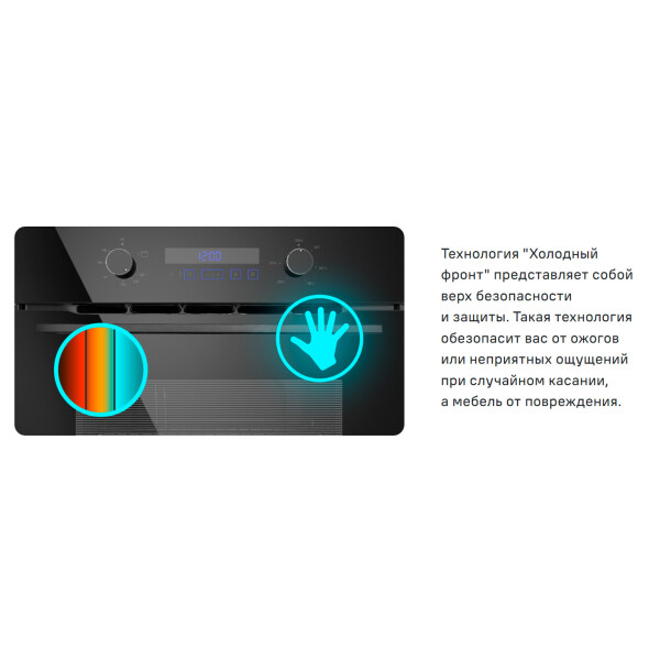 Дверца состоит из 2-х жаростойких стекол. Благодаря подобной конструкции образовывается холодный фронт, что делает процесс приготовления безопасным, исключая возможность ожога при касании.