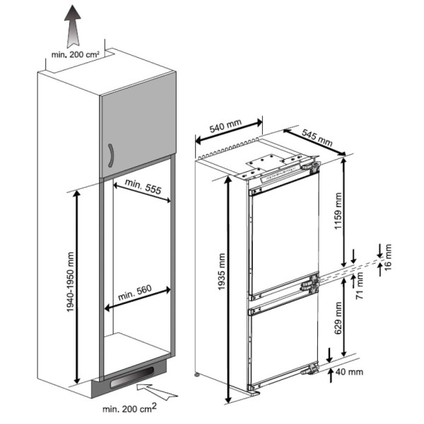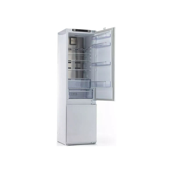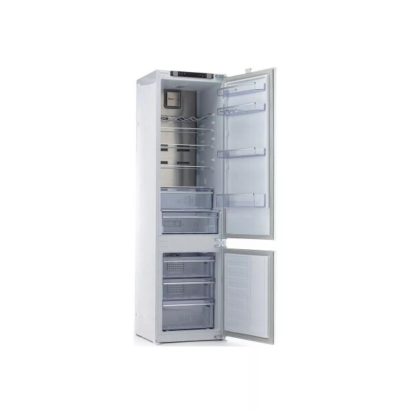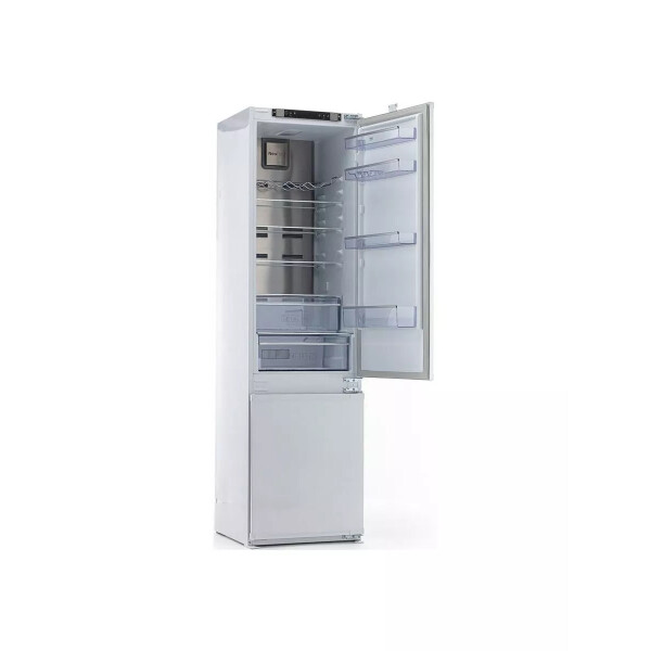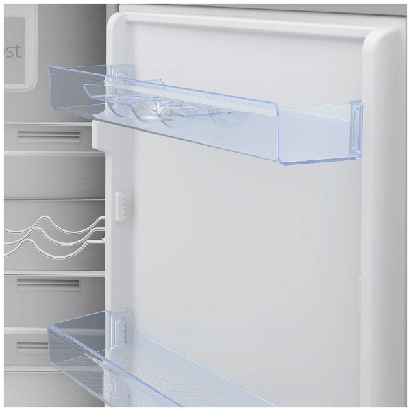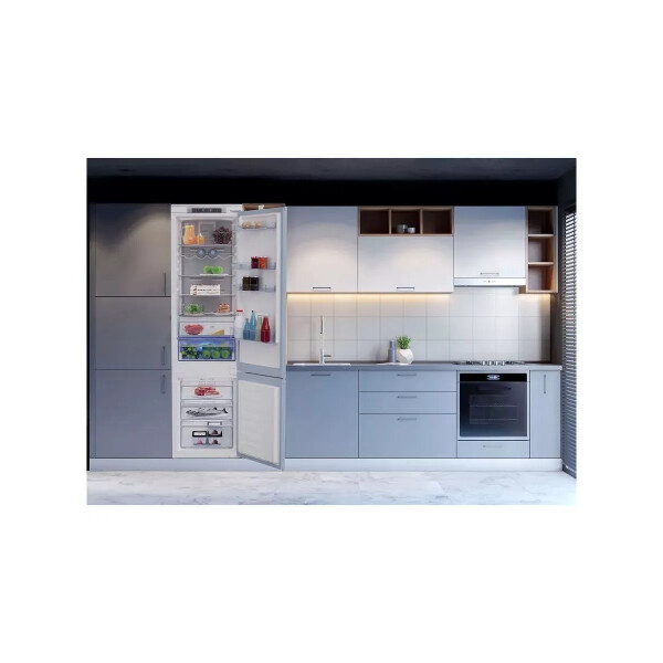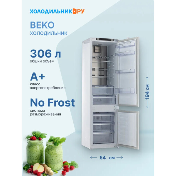Встраиваемый двухкамерный холодильник с системой охлаждения NoFrost (Ноу Фрост) не требует разморозки и имеет удобное электронное управление. Вместительная холодильная камера оснащена 4 полками и двумя ящиками для хранения продуктов, 4 дверными полками, подставкой для яиц и хромированной полкой для бутылок. Зона свежести 0C в холодильнике Beko предназначена для более длительного хранения свежего мяса, рыбы и сыра. Специальный ящик с голубой подсветкой BlueLight позволяет дольше сохранить фрукты и овощи свежими и полезными.