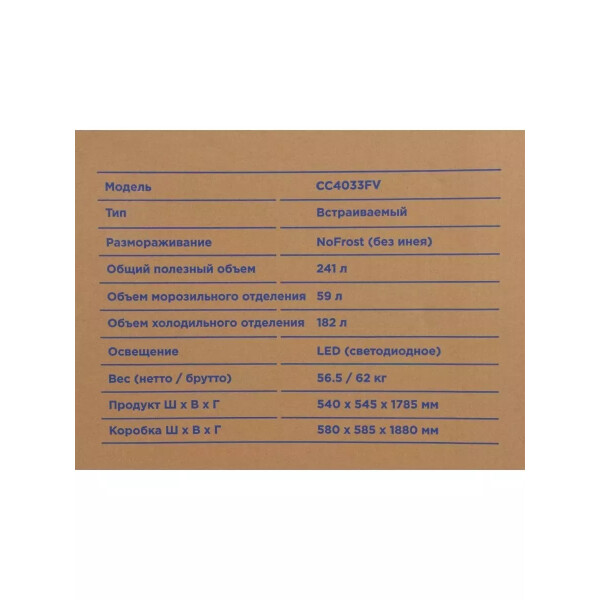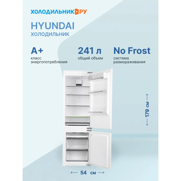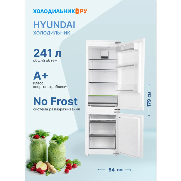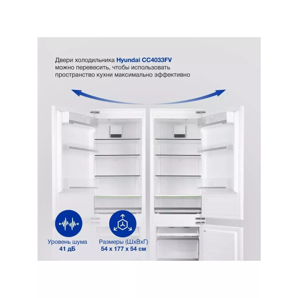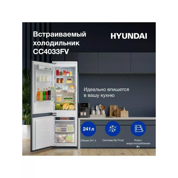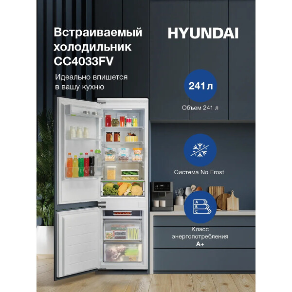 Встраиваемый холодильник Hyundai CC4033FV вместительный аппарат с общим объемом 241 л, выполненный в белом корпусе.