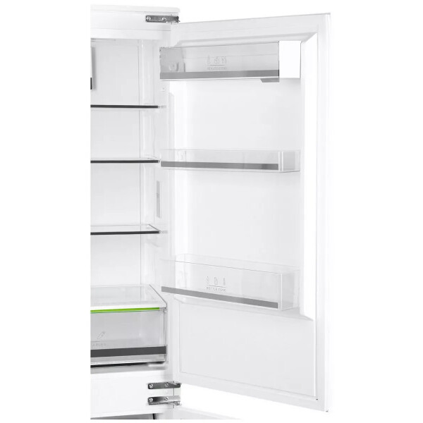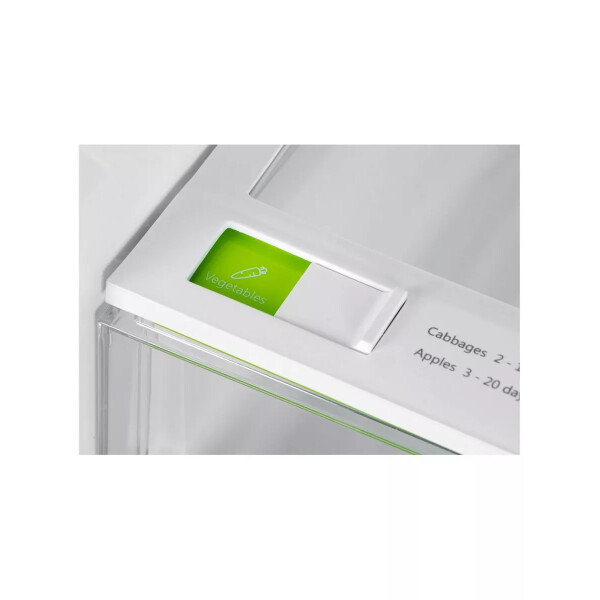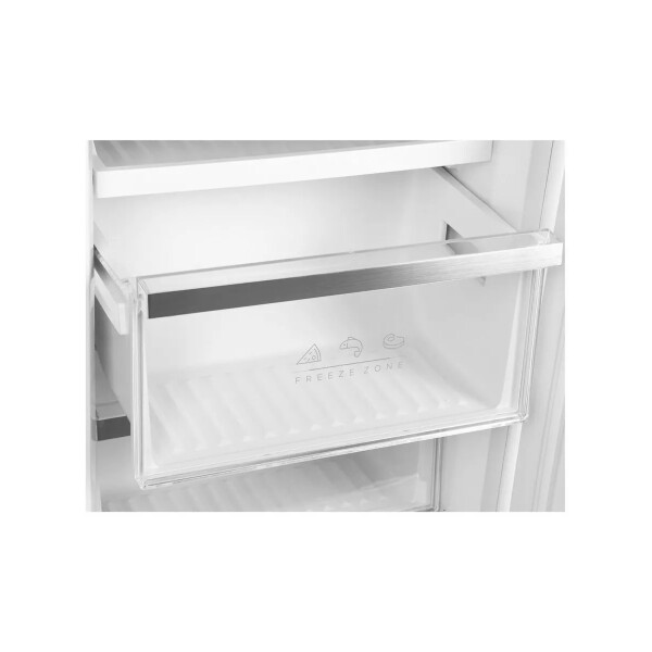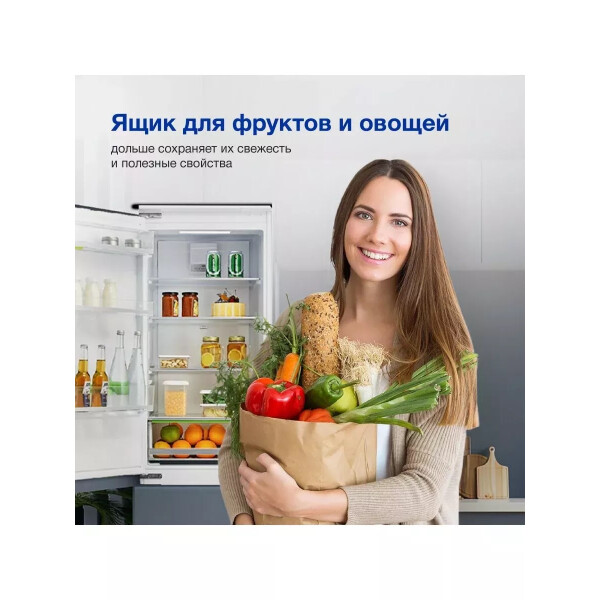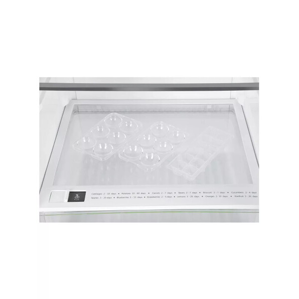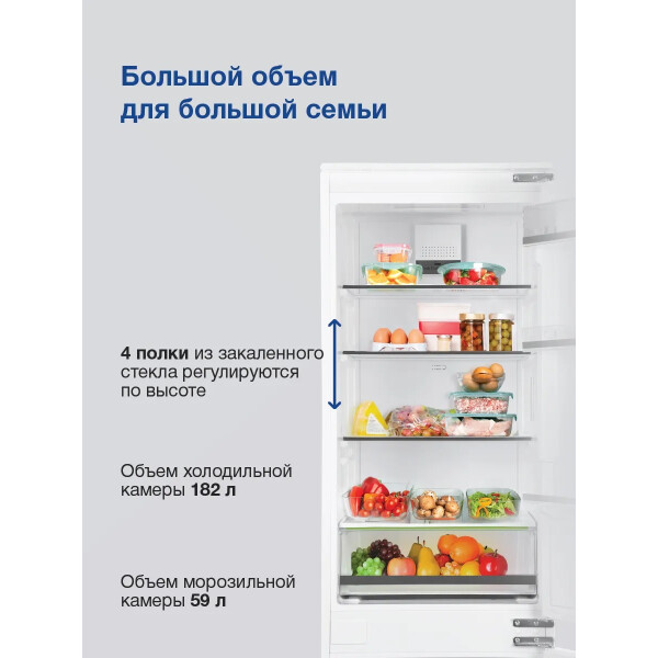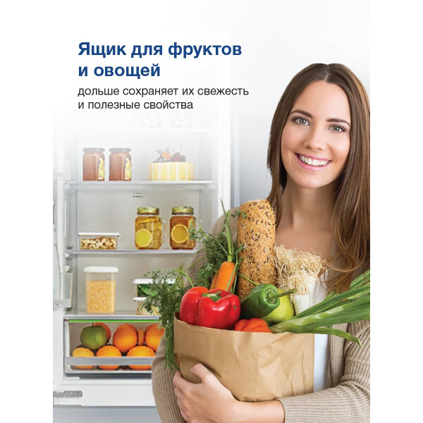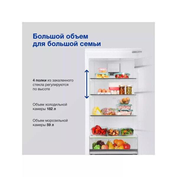 Снизу находится морозильная камера, что позволяет с комфортом доставать продукты из прозрачных ящиков. Объем полезного пространства морозильного отделения соответствует 59 л. На холодильное отделение отводится 182 л. Такого разделения будет достаточно для сохранения большого количества продуктов.