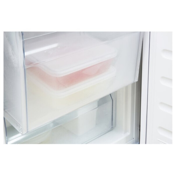 Нижний отсек встраиваемого холодильника Indesit B 18 A1 D/I является морозильной камерой, имеет вместимость на 79 л. и оборудован тремя выдвижными ящиками из прозрачного пластика. Таким образом можно с легкостью определить, что в каком ящике находится. Размораживается морозильный отсек вручную, что дает дополнительную возможность экономии энергопотребления. Во время работы двигателя холодильник производит очень мало шума, всего 35 дБ. Возможность перевешивания дверей облегчает установку холодильника в удобном месте на кухне.