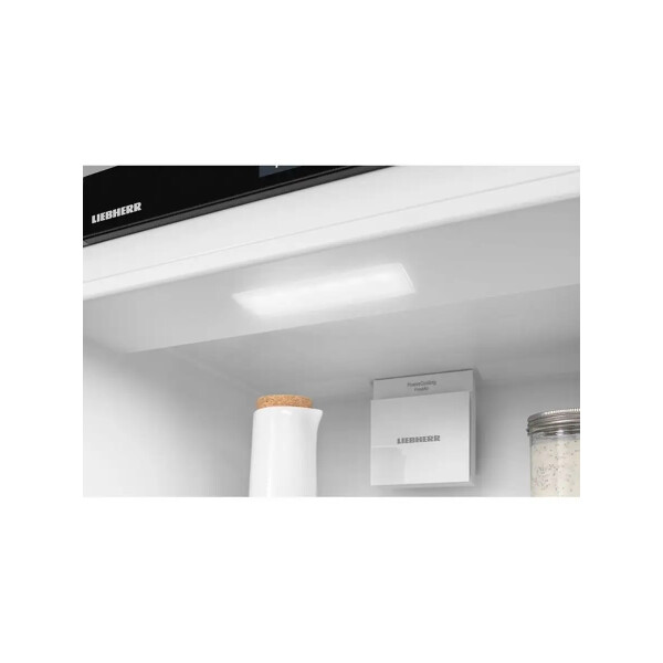 Светодиодное потолочное освещение освещает внутреннее пространство сверху для хорошего обзора продуктов. Дополнительный светлое пятно: светодиоды расположены перед стеклянными панелями, так что даже полный холодильник освещается хорошо.