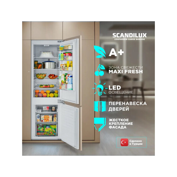 Встраиваемый двухкамерный холодильникScandilux станет Вашим новым незаменимым помощником, который бережно сохранит свежесть продуктов, а значит и самое важное здоровье!