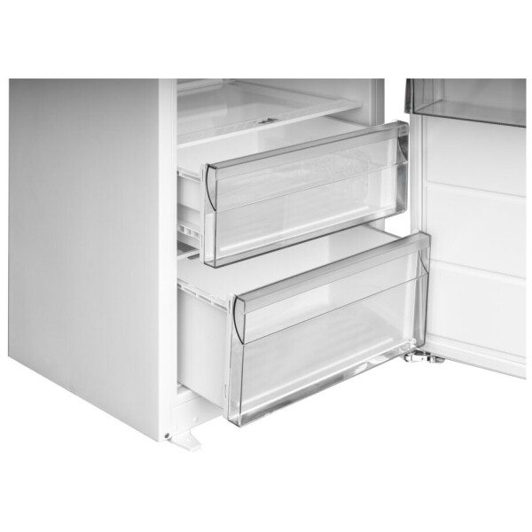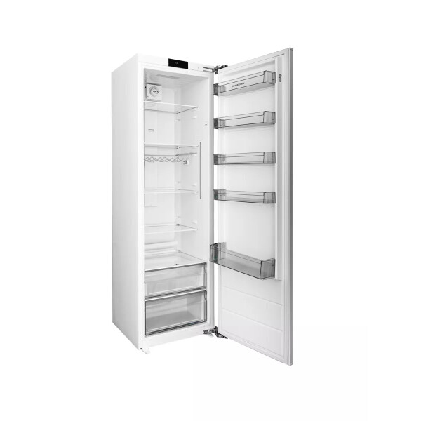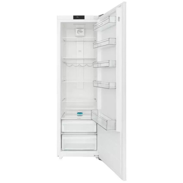 Большой объём и функциональность: холодильная камера наполнена пятью прочными полками из закаленного стекла и двумя пластиковыми ящиками для овощей и фруктов, также на дверце находятся пять полок.