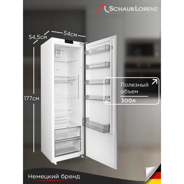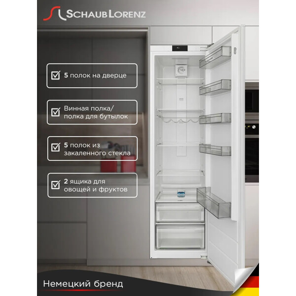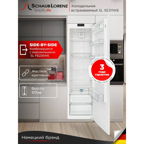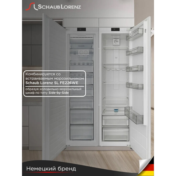 Комбинируется со встраиваемым морозильником Schaub Lorenz SL FE226WE, образуя холодильно-морозильный шкаф по типу Side-by-side.