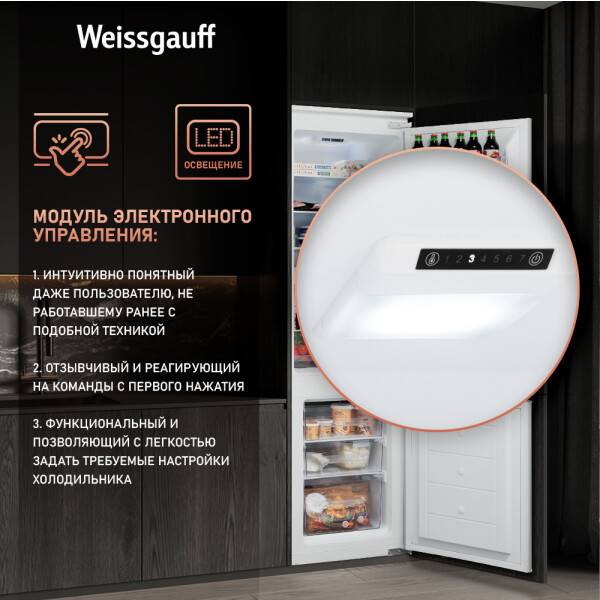 Полки холодильников Weissgauff защищены хромированными вставками и выполнены из ударопрочного стекла толщиной 3 мм, способного выдержать максимальную нагрузку до 15 кг. Пластиковые полки в дверке имеют толщину 5 мм.