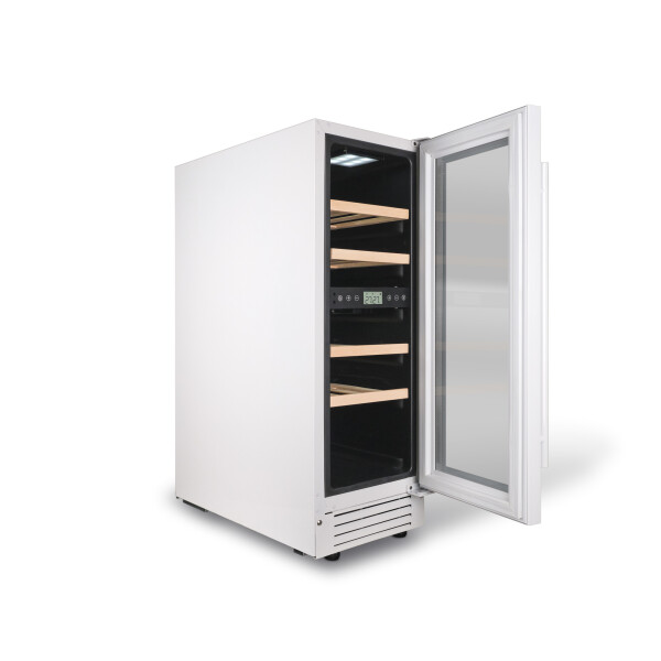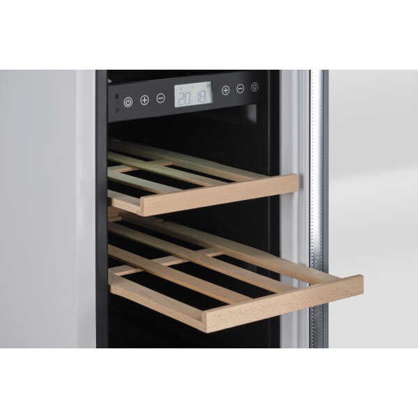 Постоянное проветривание бутылок обеспечивается бесшумными вентиляторами, установленными внутри, это предотвращает появление посторонних запахов и образование плесени. CellarPrivate CP017-2TW оснащен четырьмя деревянными съёмными полками, на которых с легкостью разместятся любые бутылки. Дверь можно перевесить так, чтобы она открывалась справа налево.