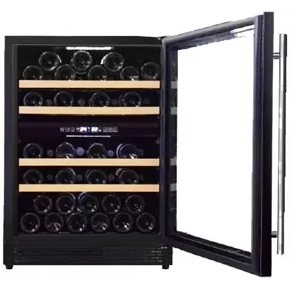 Стеклянная дверь дополнительный изящный штрих к общему дизайну модели. Специальное покрытие защищает вино от влияния ультрафиолетовых лучей, которые проникают, если шкаф находится в солнечной комнате. Цвет корпуса черный.